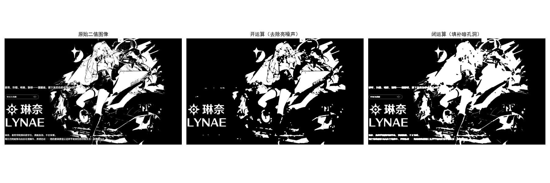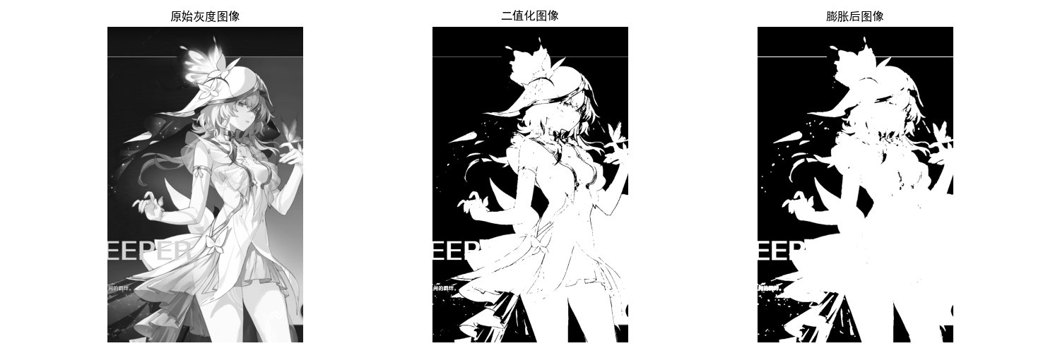 # 显示对比:原始灰度图 → 二值图 → 腐蚀后二值图