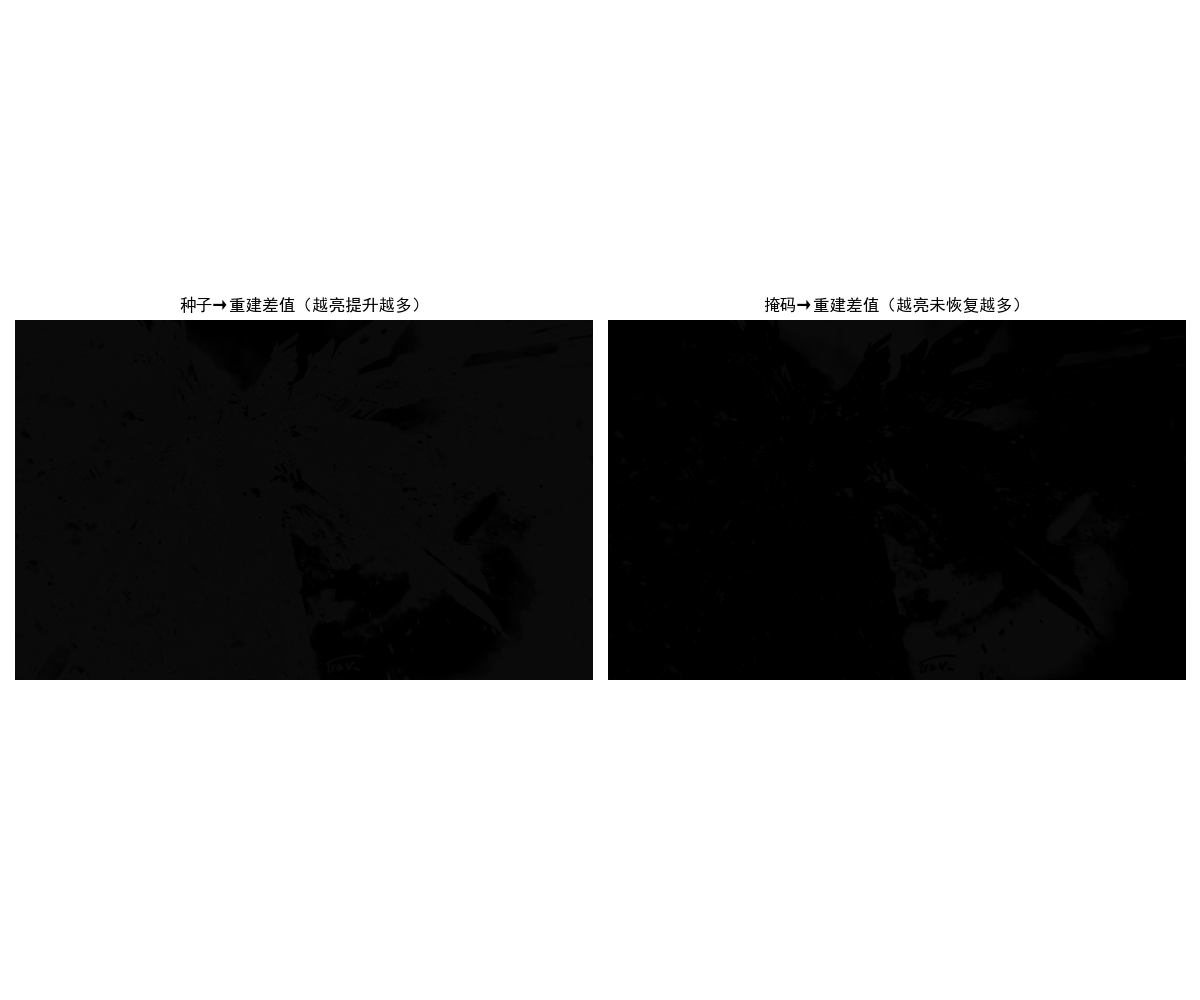 ["种子→重建差值(越亮提升越多)", "掩码→重建差值(越亮未恢复越多)"],