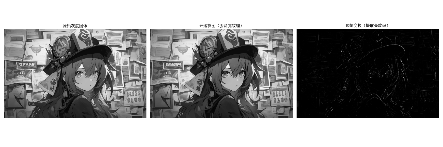 ["原始灰度图像", "开运算图(去除亮纹理)", "顶帽变换(提取亮纹理)"],