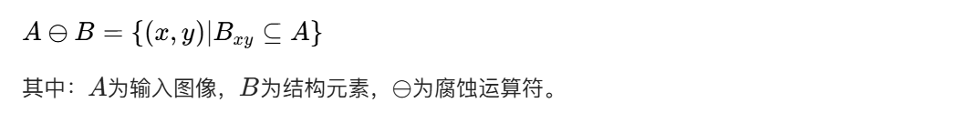 腐蚀是收缩 / 细化前景区域的操作:用结构元素扫描图像,只有当结构元素的所有像素都与图像中的前景像素重合时,原点位置才保留为前景,否则置为背景。