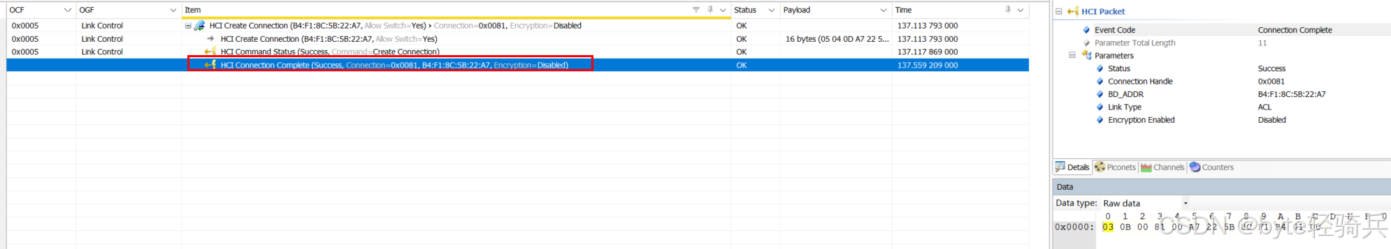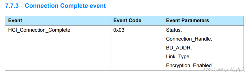 HCI_Connection_Complete 事件的事件码为 0x03。此事件是蓝牙主机控制器接口(HCI)中的一个重要事件,用于向参与连接的两个主机表明一个新的连接已经成功建立。