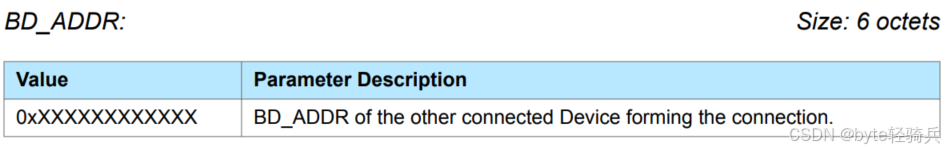 BD_ADDR表示蓝牙设备地址(Bluetooth Device Address)。用于表示与当前设备建立连接的另一个蓝牙设备的地址。