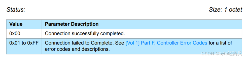 同时,对于发出 HCI_Create_Connection、HCI_Accept_Connection_Request 或 HCI_Reject_Connection_Request 命令,并随后收到 HCI_Command_Status 事件的主机来说,该事件也用于告知其之前发出的命令最终是否成功。