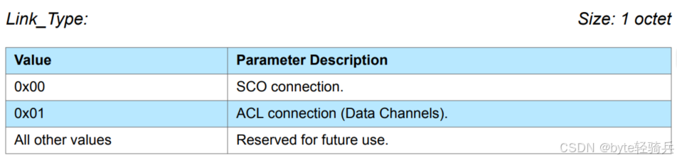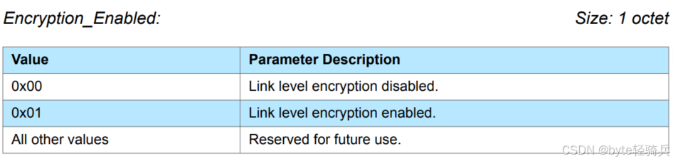 0x00:表示 SCO(Synchronous Connection-Oriented)连接。SCO 连接主要用于语音传输,因为它提供了固定的带宽和较低的时延,对于实时语音通信至关重要。0x01:表示 ACL(Asynchronous Connection-Less)连接(数据通道)。ACL 连接用于数据传输,它提供了更灵活的带宽分配,可以适应不同类型的数据传输需求。ACL 连接是非面向连接的,意味着数据包可以在任何时候发送,而不需要先建立连接状态。Encryption_Enabled 参数用于指示链路层加密是否已启用。