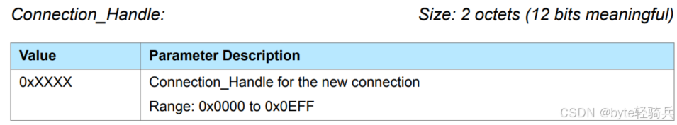 Connection_Handle 的有效值范围。由于只有12位是有效的,因此其最大值为 0x0EFF(即二进制的 0000 1110 1111),最小值为 0x0000。这个范围确保了 Connection_Handle 的唯一性,在同一时间内,蓝牙控制器不会为不同的连接分配相同的句柄。在处理 HCI_Connection_Complete 事件时,主机应检查 Connection_Handle 参数的值,并将其存储在适当的数据结构中,以便在后续操作中使用。如果连接失败,则可能不会提供有效的 Connection_Handle。