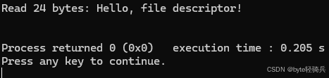 ssize_t read(int fd, void *buf, size_t count);fd:文件描述符,由 open 函数返回的一个非负整数,用于标识要读取数据的文件、设备等。buf:指向用于存储读取数据的缓冲区的指针,数据将被读取到这个缓冲区中。count:期望读取的字节数,即希望从文件描述符对应的文件或设备中读取的最大字节数。errno 会被设置为相应的错误码,用于指示具体的错误原因。#include <fcntl.h>