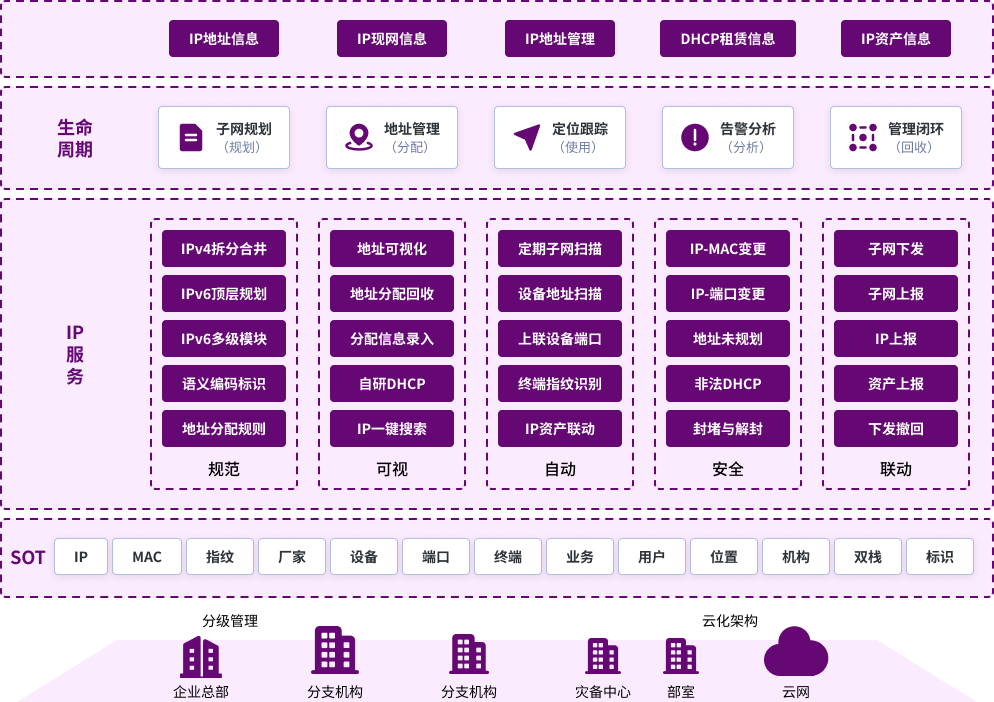 IPAM管理 | 1. IP地址全生命周期可视化管控;2. 闲置地址智能回收与预警;3. 配置变更自动化审计 | 实现地址资源精细化管理,降低人工运维成本 | 跨地域企业、多分支机构网络 |