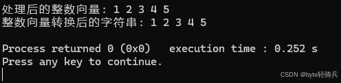 std::cout << "整数向量转换后的字符串: " << output << std::endl;