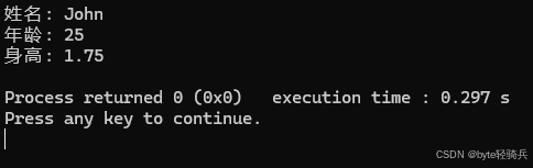 定义了一个 Person 结构体,用于存储个人信息。然后,定义了一个 parsePerson 函数,用于从一个包含姓名、年龄和身高的字符串中解析出个人信息。在函数内部,使用 istringstream 和提取运算符 >> 从字符串中读取数据,并将它们存储在 Person 结构体中。