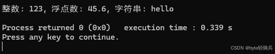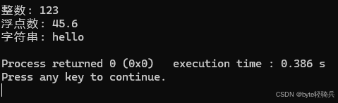 创建了一个 stringstream 对象 ss。首先,使用插入运算符 << 将字符串 "123 45.6 hello" 写入 ss 中。然后,使用提取运算符 >> 从 ss 中读取一个整数、一个浮点数和一个字符串,并将它们分别存储在变量 num、d 和 str 中。最后,将读取的数据输出到控制台。