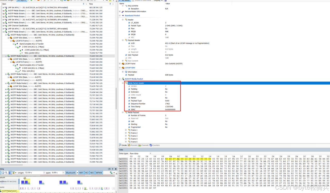 理解Media Packet Header中的字段是排查蓝牙音频问题的关键: