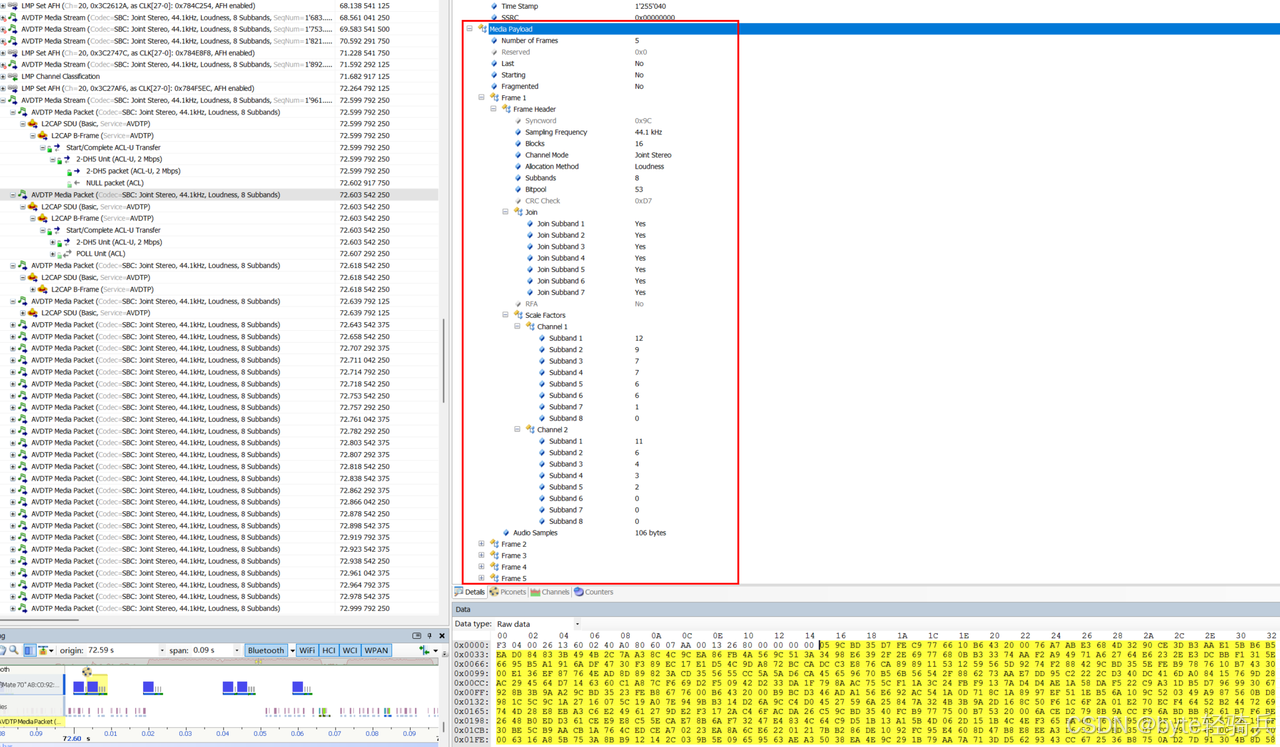 SBC(Subband Coding)作为 A2DP 协议的默认音频编码,其 Payload 结构具有代表性。