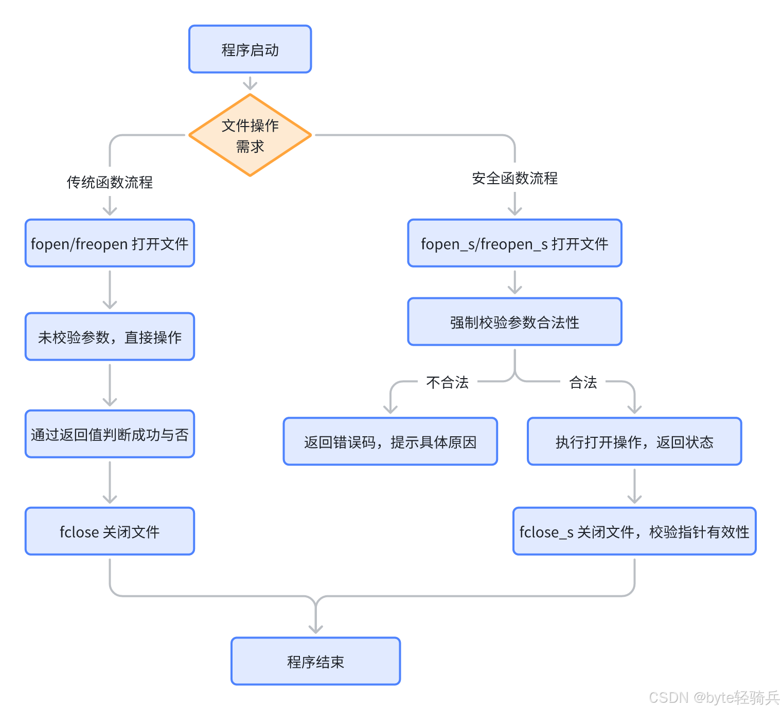 为应对这些问题,C11标准(ISO/IEC 9899:2011)在附录K中定义了“边界检查接口”,即_s系列安全函数。这类函数的核心优势在于:强制参数校验、提供精确错误码、明确资源管理规则,从源头降低安全风险。文件打开与关闭相关的核心_s函数包括fopen_s(文件打开)、freopen_s(文件重定向)、fclose_s(文件关闭),其调用流程与传统函数的对比如下: