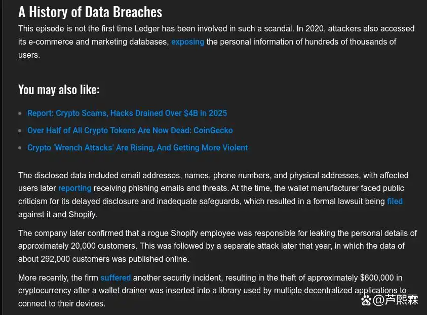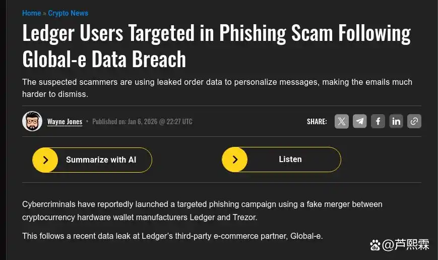 近年来,随着去中心化金融(DeFi)和非同质化代币(NFT)市场的快速发展,用户对私钥自主管理的需求显著上升,硬件钱包作为冷存储解决方案的核心载体,其市场渗透率持续增长。Ledger与Trezor作为行业头部厂商,长期以物理隔离、离线签名和防篡改芯片等技术保障用户资产安全。然而,2026年1月曝光的一起针对Ledger用户的钓鱼攻击事件表明,即便硬件设备本身未被攻破,其外围生态——尤其是电商分销与物流履约环节——仍可能成为攻击入口。