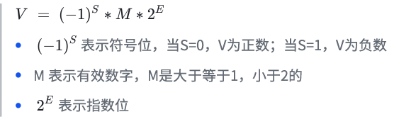 根据国际标准IEEE(电气和电子工程协会)754,任意⼀个二进制浮点数V可以表示成下面的形式
