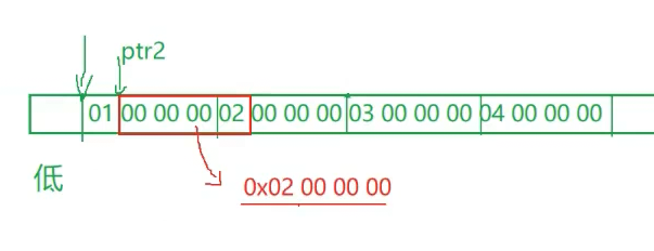 (int)a表示把数组首元素地址取出来后转化为整型数据后加1就是地址加1,比如0x11223343+1后就是0x11223344(多了一个字节),然后ptr2是一个整型类型的指针,解引用后就是多了一个字节的地址的数据,但这是小端存储,就要还原该有的数据,就是02000000