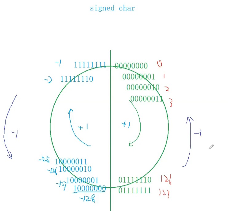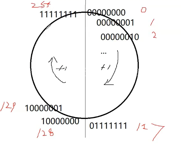 如果顺时针方向循环转动就是0,1,2,3,……126,127,-128,-127……-2,-1,0,1,2……