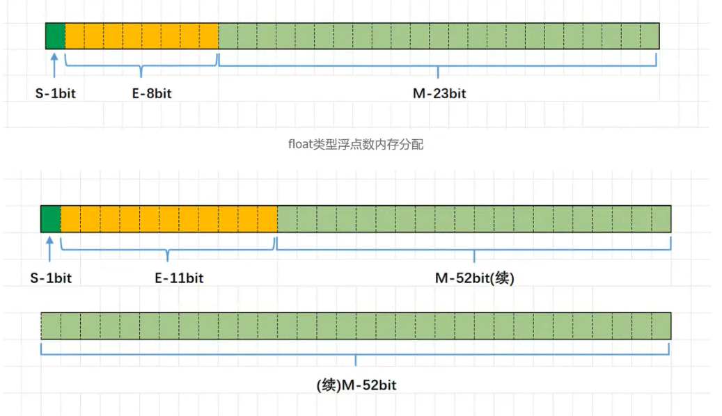 对于32位的浮点数,最高的1位存储符号位S,接着的8位存储指数E,剩下的23位存储有效数字M 对于64位的浮点数,最高的1位存储符号位S,接着的11位存储指数E,剩下的52位存储有效数字M