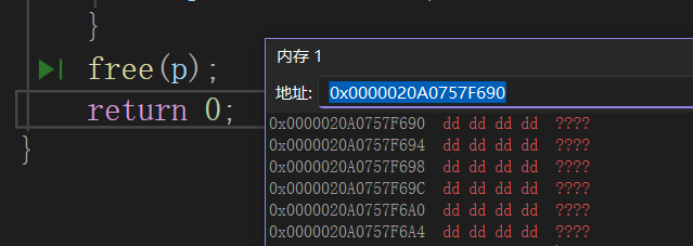 }可以看到所有的空间的数据全部清空,但地址依旧没变,说明只是将空间的使用权限还给了操作系统,但p指向的指针还是原来的起始位置,这个时候p就指向的是野指针,而我们还要把野指针转化成空指针