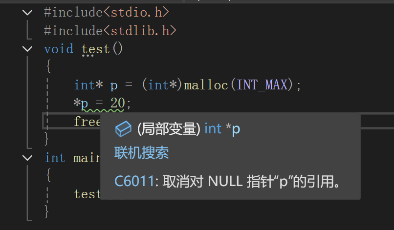 }此时我申请了一块空间,但我没有对p进行判断是否为NULL,这个时候就很危险了,此时编译器就会出现警告,他怀疑p的地址为NULL