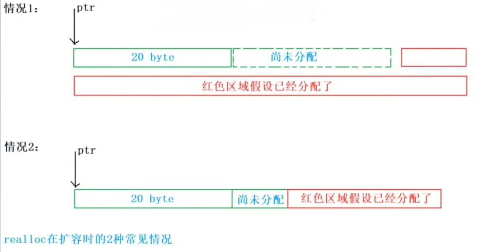 void* realloc (void* ptr, size_t size);情况1:原有空间之后有足够大的空间 。 情况2:原有空间之后没有足够大的空间