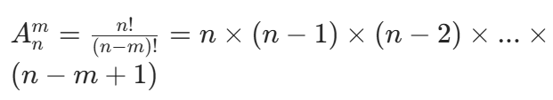 理解:排列强调 “顺序”。比如从 1、2、3、4 四个数中选 3 个排成一列,123 和 321 是不同的排列,因为顺序不同。计算时,第一个位置有 n 种选择,第二个位置有 n-1 种(选了一个元素后剩下的),以此类推,直到选够 m 个位置,所以是 m 个连续整数的乘积。