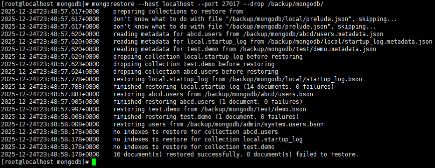 2025-12-24T23:45:48.112+0800 done dumping local.startup_log (14 documents)逻辑还原(mongorestore)