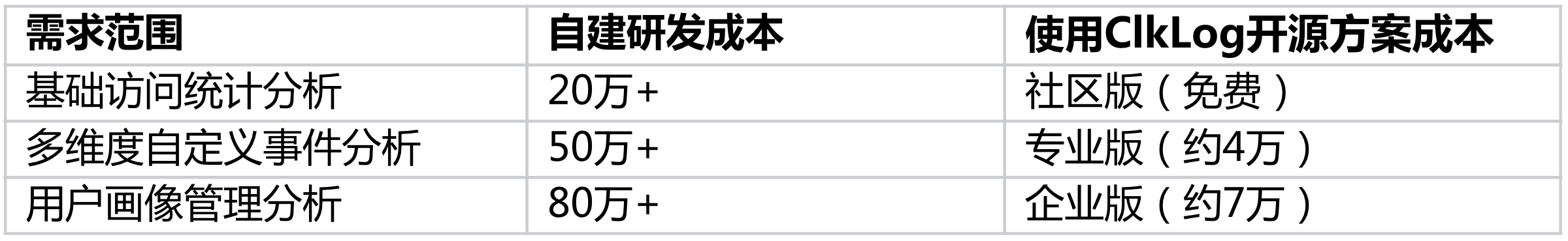 基于ClkLog开源方案搭建首期成本可控制在几万,最快一周完成部署集成,可以快速交付使用,并具备持续扩展的能力。