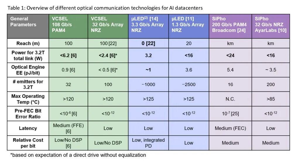 这种可靠性的提升,加上链路波动的减少,可减少重启次数,从而将训练成本降低约50%。对于microLED,单个发射器的典型故障发生率(FIT)预计为0.1,在2 Gbit/s速率下,3.2 Tbit/s模块的发射器总故障发生率(FIT)为160。低速宽通道(WaS)方案(尤其是microLED和VCSEL阵列)的优势在于易于实现冗余通道——添加15%的冗余通道后,总链路的故障发生率(FIT)有望降至10以下。