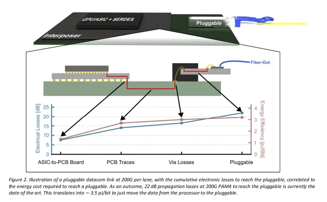 能效是CPO技术的核心指标之一。在200 Gbit/s速率下,数据从处理器传输至电路板边缘,包括串并转换器(SerDes)和短距离链路DSP,需消耗约3.5 pJ/bit。图2展示了从加速器(XPU)到可插拔器件的过程中,每条铜缆线路和每个接口对电信号损耗的影响,以及为校正由此产生的信号失真所需的能量成本。参考可插拔链路为无源铜缆链路,由于额外的DSP,总能量效率为5 pJ/bit,在200 Gbit/s速率下最大传输距离为1米。