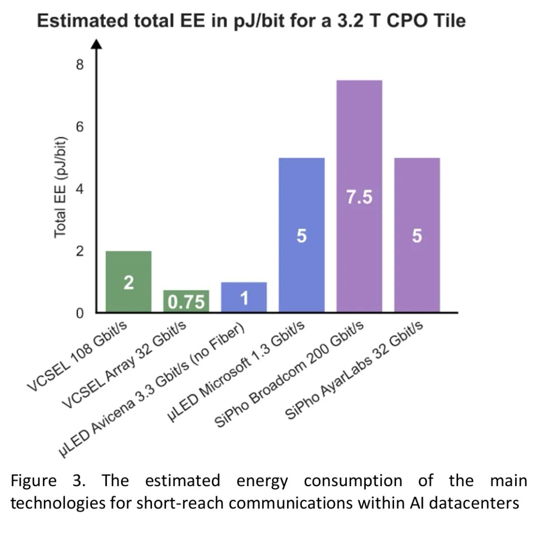 另一种方案是在可插拔器件内部采用低速宽通道(WaS)技术,例如微软(Microsoft)通过microLED实现了可插拔器件3.6 pJ/bit的能量效率,总能量效率为6.6-7 pJ/bit。