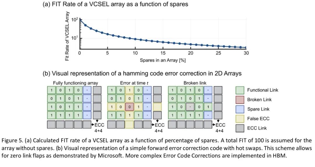 此外,微软(Microsoft)的研究表明,在低速宽通道(WaS)方案中,通过冗余通道与纠错码的结合,不仅可以从短期链路中断中恢复,还能通过热插拔任何故障链路实现长期链路激活。微软(Microsoft)的方案预测链路比铜缆更具韧性,类似方案也可应用于VCSEL阵列。图5(b)展示了带冗余通道和热插拔功能的二维阵列纠错码示意图。