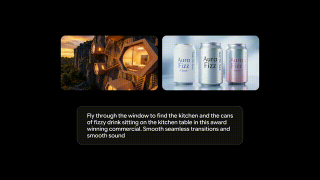 上传一张屋子概念图,以及一张汽水图,然后让Veo 3.1实现一个运镜效果:从窗户外拉近到厨房桌子上的汽水。