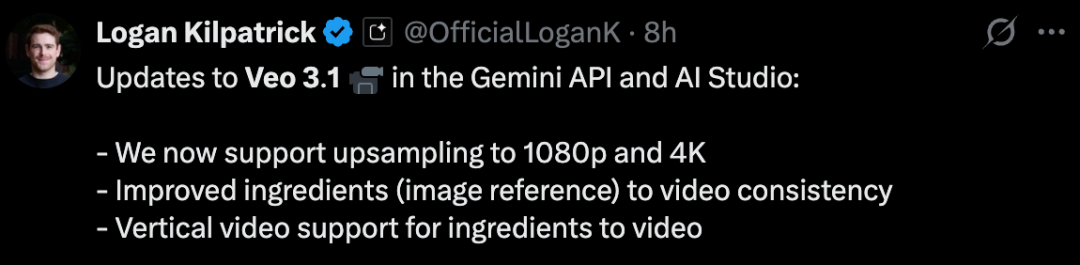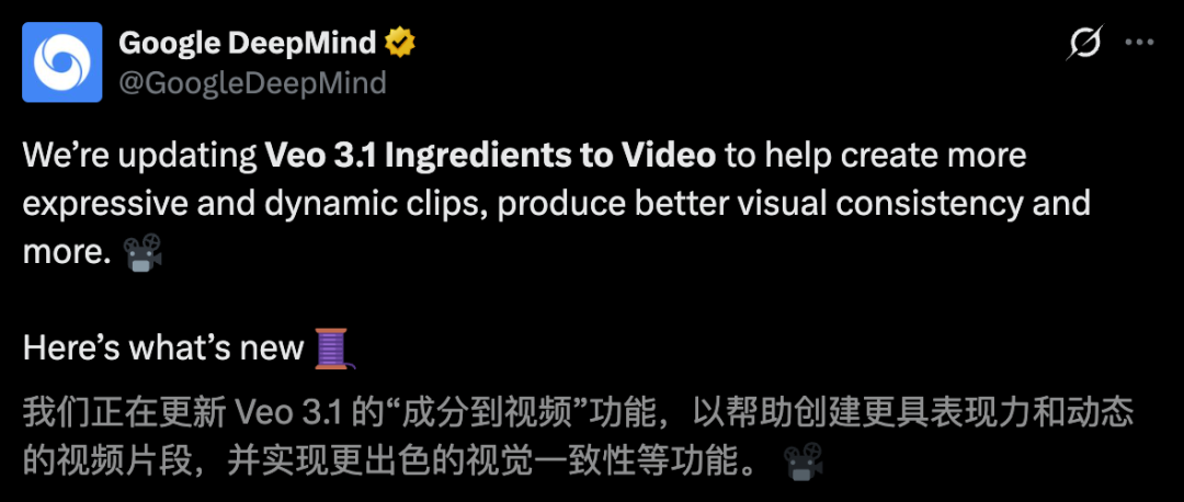 增强版Veo 3.1「素材生视频」和原生竖屏格式支持正陆续向Flow、Gemini API、Vertex AI和Google Vids推送;