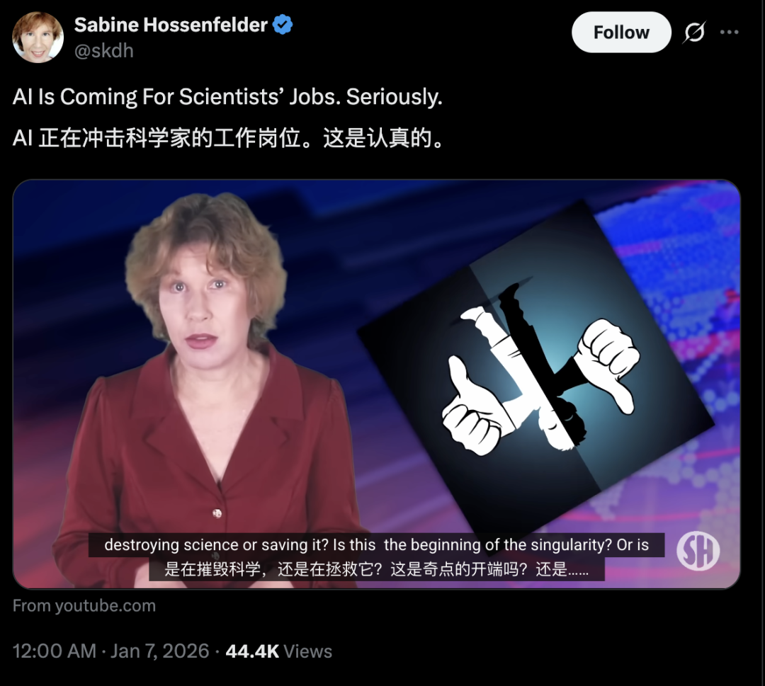 近日,德国物理学家、百万粉丝科普博主Sabine Hossenfelder在一则视频中,抛出了一个让学术界「脊背发凉」的观点: