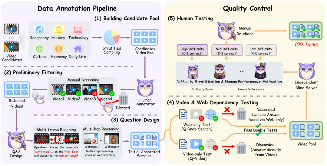 为了保证评测的含金量,VideoDR并没有采用自动化生成,而是进行了严格的人工标注与质检。