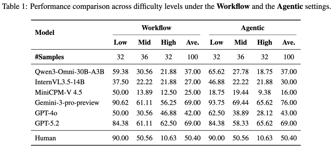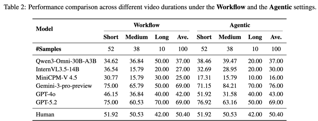 强如Gemini-3在Agentic模式下能利用长上下文获得提升,而部分开源模型在长视频下性能反而大幅下降。