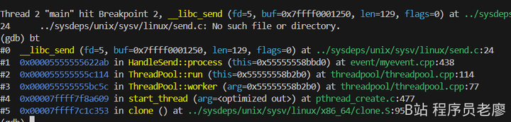 Breakpoint 1 at 0x5555555590ad: file main.cpp, line 3.通过info threads可以看到 共有五个线程,其中主线程是调用了epoll,再加上README的讲解可以推断出来这个项目是单个epoll +线程池的模式
