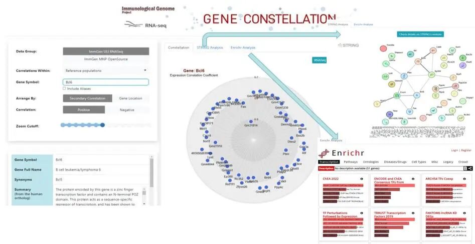 【Gene constellation】基因互作查询:在这个模块中就是查询基因与其他基因的互作情况。有constellation,STRING 蛋白质互作分析,Enrichr Analysis 进行转录因子分析等。