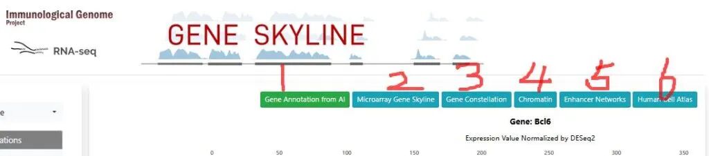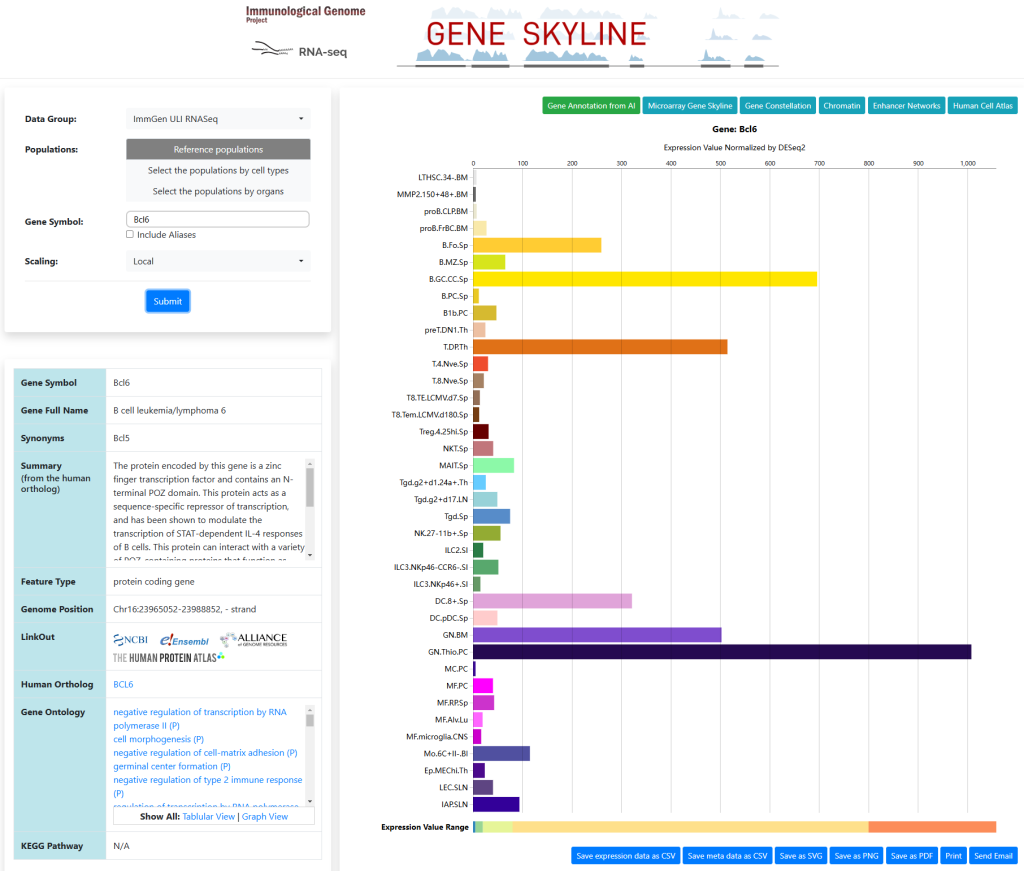 2. Gene Skyline查询基因在不同组织来源中免疫细胞中的表达情况。在这个界面中可以通过Data Group选择不同来源数据集,通过Populations选择细胞类型与组织来源,右侧显示目的基因的表达情况,左侧下方是基因的基本介绍与功能注释。而在表达谱上方还存在多个模块查询该基因相关调控转录信息。