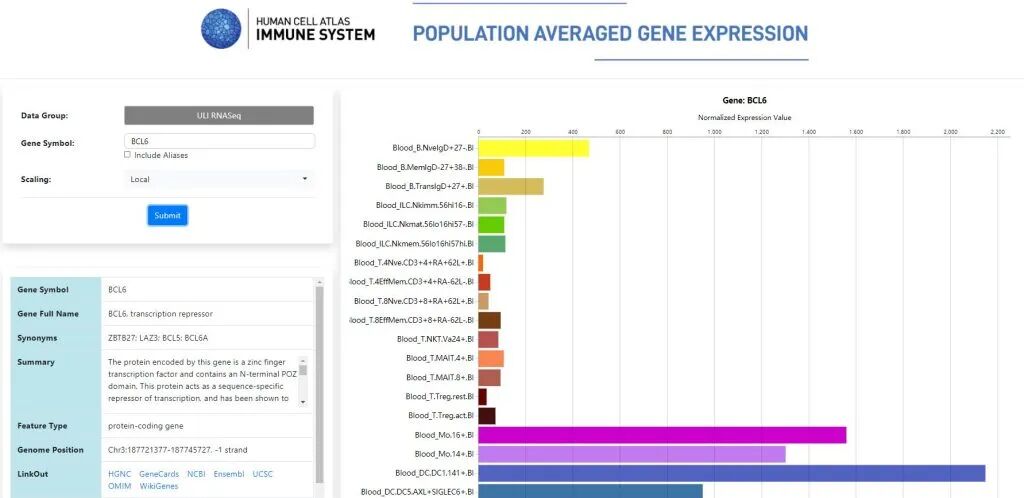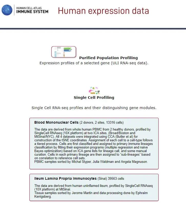 5. Human expression data模块进行基因表达查询:在这个模块中,Purified population profiling 已经在上文提及。因此我们下文主要将单细胞数据-Single cell profiling:外周血与回肠固有层免疫细胞组织来源。