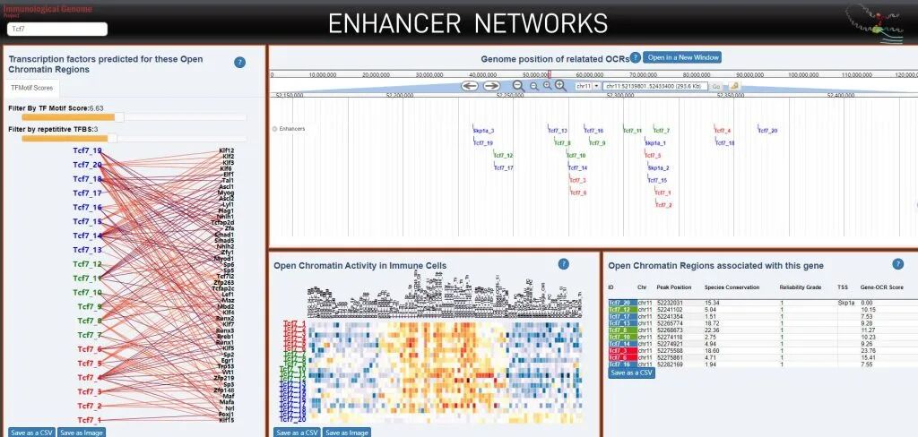 【Enhancer networks】增强子网络模块:输入基因后,分析基因上下游位点结合不同转录因子的情况,于此同时,Open Chromatin activity inImmune Cells可以看到在不同细胞发育阶段中该基因位点的染色质可及性变化。Genome Position o f related OCRs查看基因位点中开放区域。