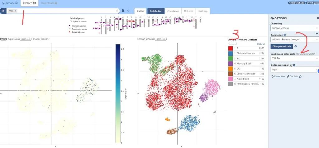 Human expression data模块下外周血基因表达探索:在跳转界面中输入目的基因,选择注释类型,然后查看不同注释细胞类型。