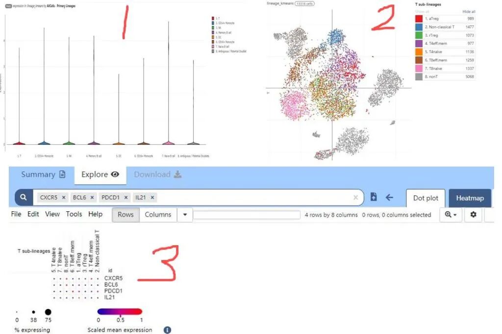 1可以查看基因在不同细胞类型中的表达情况,2-可以将T细胞进行进一步亚群细化。3.可以进行多个基因在不同细胞类型中的表达谱热图绘制。
