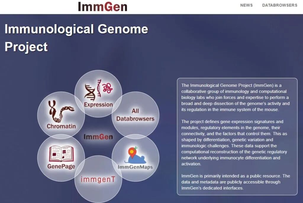 Immunological Genome Project”免疫基因组计划(ImmGen)是一个小鼠免疫百科全书平台。其核心目标是通过高通量基因组学技术,深度解析基因组在免疫系统中的活性与调控机制。该项目不仅定义了不同免疫细胞类型的基因表达“签名”和协同工作的基因“模块”,还致力于寻找控制基因开关的调控元件(如启动子、增强子),并研究这些元件之间的连接方式以及控制它们的转录因子。这种系统性的研究方法,旨在构建一个全面的分子图谱,从而为理解免疫系统的复杂性提供坚实的基础。