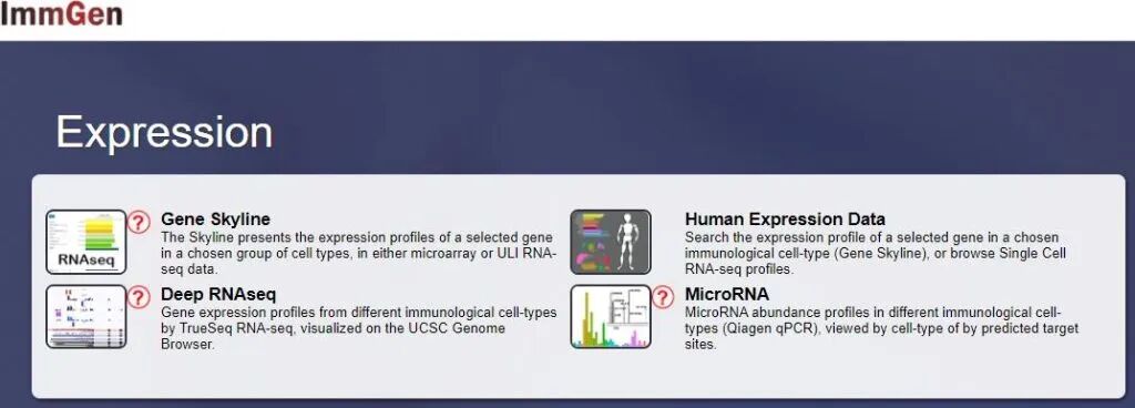 Expression:基因表达数据,这是ImmGen的核心内容之一,提供不同免疫细胞类型和状态下的基因表达谱。