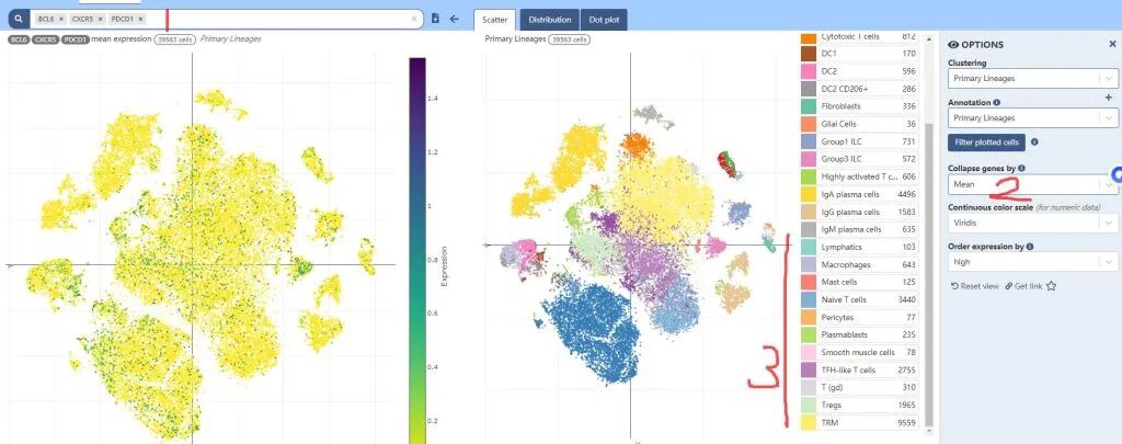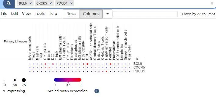 Human expression data模块下回肠固有层免疫细胞组织基因表达探索:在这个组织中,免疫细胞亚群类型非常丰富多样。因此可以用来分析小亚群细胞类型中基因表达情况。