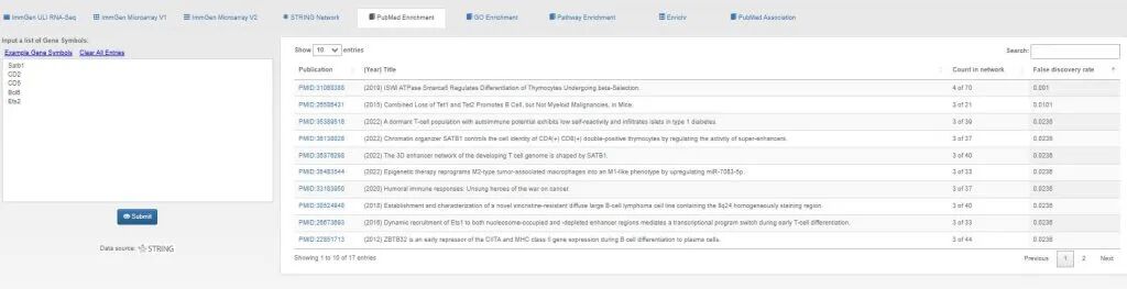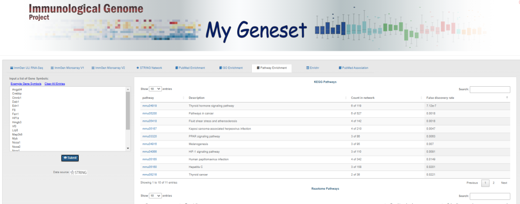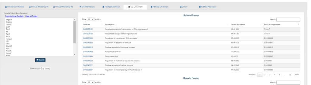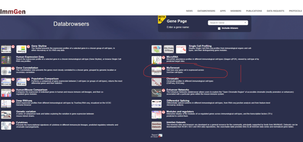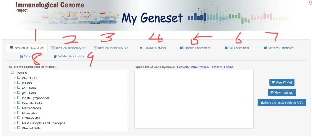 在DataBrowsers页面,是所有分析模块的汇总界面。在这个页面中,许多模块已经在之前提及。本文主要来探索MyGeneset这个分析模块功能。是免疫基因集的“工作台”。用户首先可以查看基因在 ImmGen 的不同历史数据集(V1芯片、V2芯片、ULI测序)中的表达情况,然后利用工具链(从分子功能 GO 到通路 Pathway,再到文献关联 PubMed 和外部数据库 Enrichr)全方位地解析该基因集的生物学功能和潜在意义。
