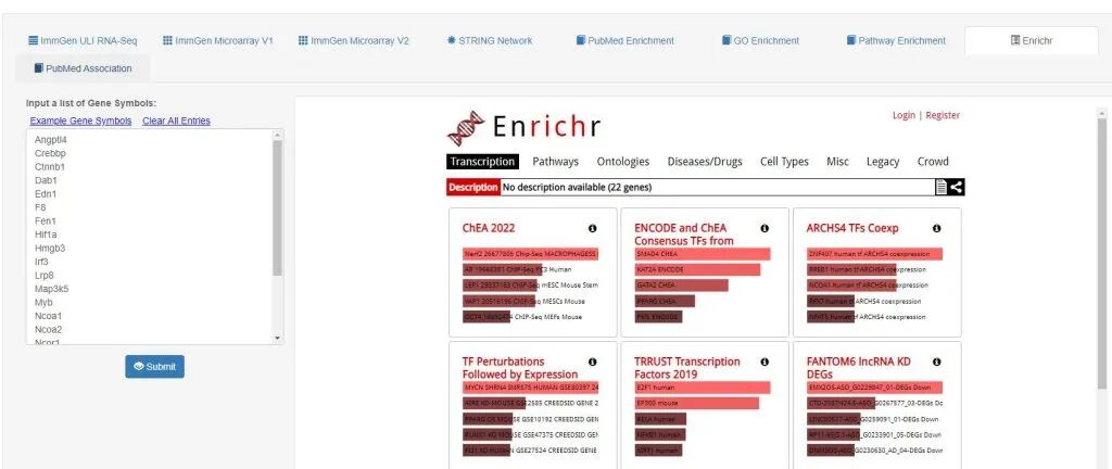 Enrichr:这是一个综合性的外部知识库分析平台。它整合了数千个基因集库(包括转录因子靶点、药物反应、疾病状态等),通过连接 Enrichr,用户可以将基因列表与这些庞大的外部数据库进行比对,发现意想不到的生物学联系。在这个网站利用Enrichr进行基因集分析,比在ENrichr官网分析用时更短。
