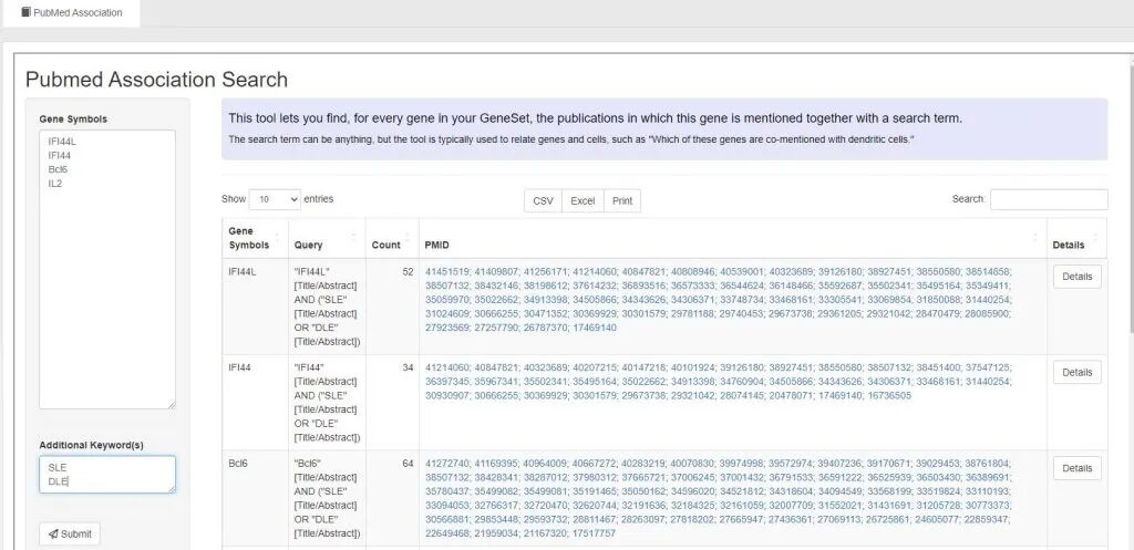 PubMed Association:通常用于展示基因与特定 PubMed 文献的直接关联,可能提供具体的参考文献列表。 第一个输入框输入不同的基因集,第二个输入库输入附加关键词(可以是疾病类型、细胞名称与生物学过程),右侧是文献搜索结果。点击Detail详情。可以查看每一篇文献摘要内容。基因与关键词被标记。